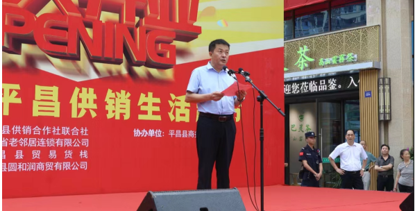 中共平昌縣縣委副書記曹光輝代表平昌縣委、縣政府致辭。他指出,省供銷社及直屬集團(tuán)公司對平昌縣供銷社給予了高度重視和大力支持,2021以來,向平昌縣支持了綜合改革、農(nóng)業(yè)社會化服務(wù)、茶葉產(chǎn)業(yè)等6個項(xiàng)目,投入項(xiàng)目補(bǔ)助資金1311萬元,使平昌成為首個全省供銷系統(tǒng)為農(nóng)服務(wù)綜合平臺建設(shè)試點(diǎn)縣。他認(rèn)為,“老鄰居•平昌供銷生活超市”的順利開業(yè),標(biāo)志著平昌供銷為農(nóng)服務(wù)綜合平臺試點(diǎn)縣建設(shè)取得了重要成果,也預(yù)示著“老鄰居”品牌在平昌這片熱土上的新生,這一創(chuàng)新舉措既是強(qiáng)基固本、優(yōu)城興業(yè)的生動體現(xiàn),更是開放合作、守正創(chuàng)新的具體實(shí)踐。他強(qiáng)調(diào),“老鄰居•平昌供銷生活超市”連鎖網(wǎng)絡(luò)的問世,給平昌人民提供了大量的就業(yè)崗位,彰顯出“保供、保質(zhì)、穩(wěn)價”公有制企業(yè)特性,為平昌經(jīng)濟(jì)社會帶來了全新的物流業(yè)態(tài)和消費(fèi)時尚。他表示,要以省市供銷社對平昌縣的重視和關(guān)懷為契機(jī),以《四川省供銷合作社條例》為準(zhǔn)則,以“兩個加快”為抓手,主動擔(dān)當(dāng)作為,全面推進(jìn)供銷合作社綜合改革,奮力推動供銷合作事業(yè)高質(zhì)量發(fā)展。