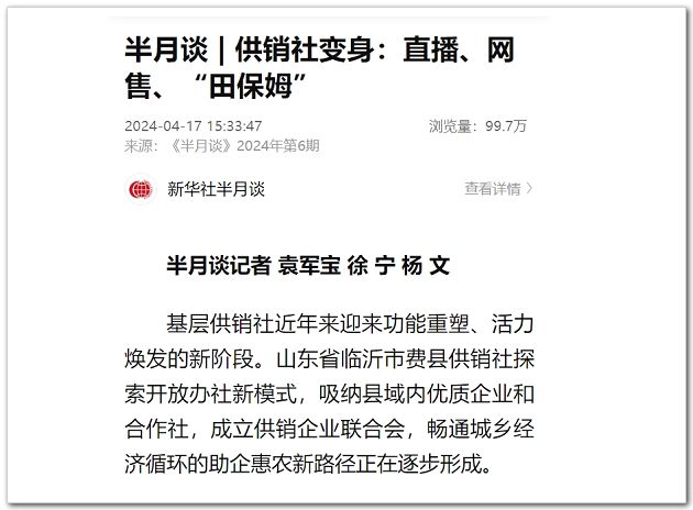 “供銷社利用渠道優(yōu)勢,避開中間商收購倒賣,保障農(nóng)產(chǎn)品在收購端高于當(dāng)?shù)厥袌鰞r,在零售端低于市場價,使農(nóng)民和消費(fèi)者的利益都得到保障。”王慶華表示,2024年,費(fèi)縣供銷社將以開放辦社為抓手,持續(xù)建設(shè)數(shù)字供銷運(yùn)營平臺,暢通縣鄉(xiāng)村三級現(xiàn)代商貿(mào)流通服務(wù)網(wǎng)絡(luò),不斷筑牢供銷社“為農(nóng)、務(wù)農(nóng)、姓農(nóng)”根基。
